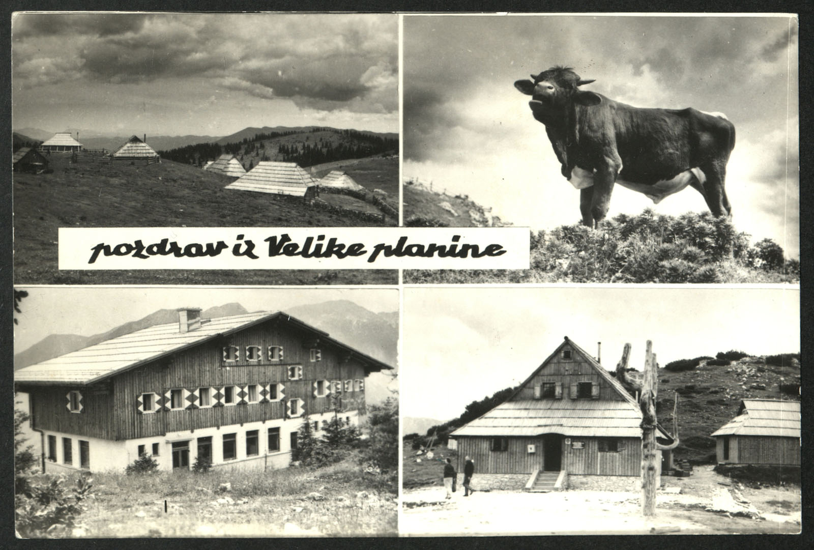 Štirje značilni posnetki Velike planine: planinske koče, Hotel Šimnovec, in Gostišče Zeleni rob