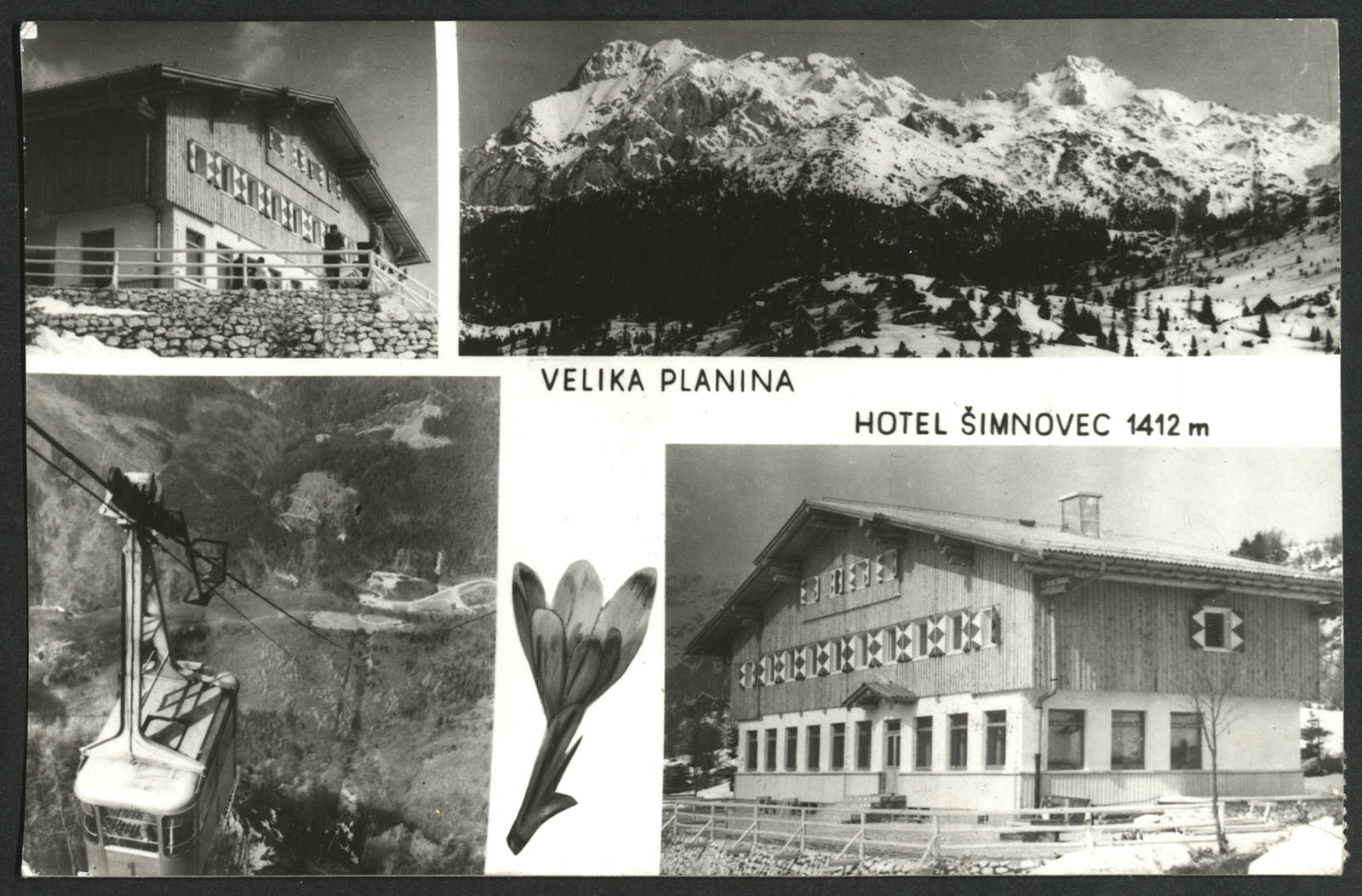Štirje posnetki Velike planine: turistično naselje, žičnica in hotel Šimnovec.
