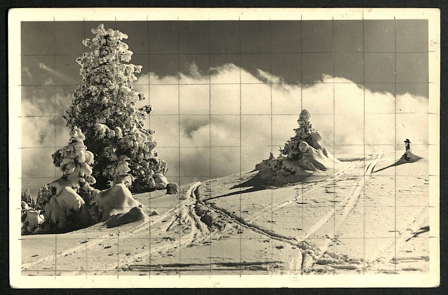 Pogled na smučine med smrekama na Veliki planini.
