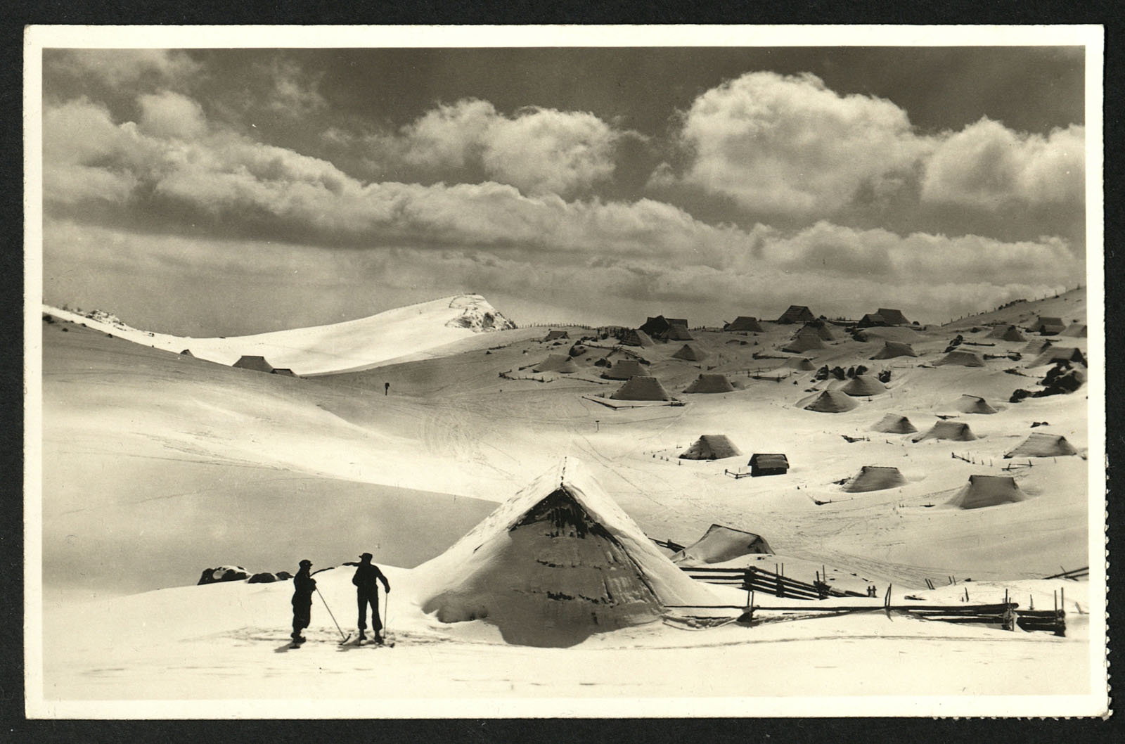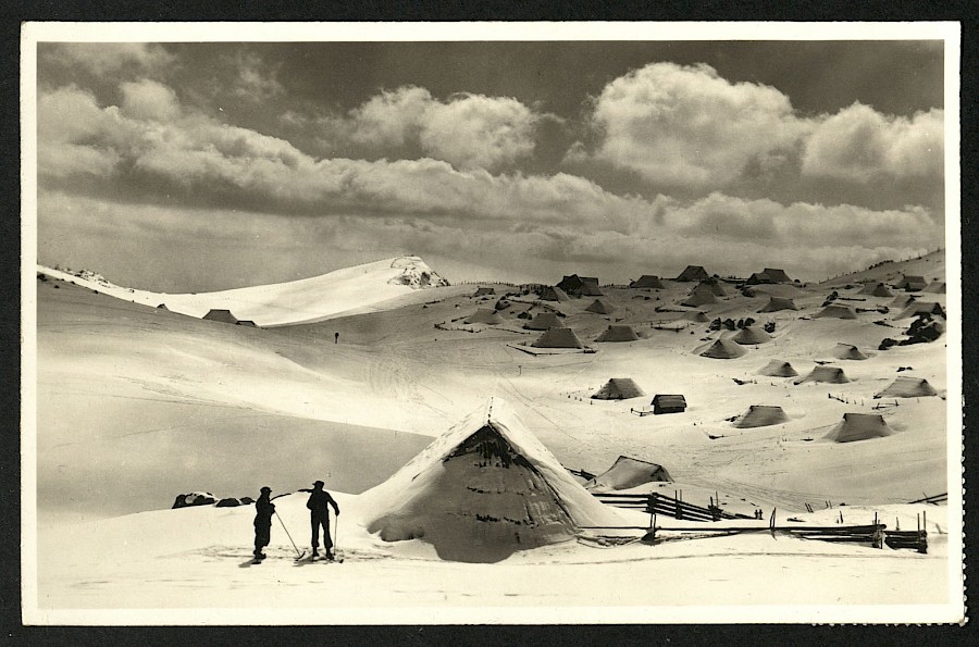 Smučanje na zasneženi Veliki planini. V zimi 1931/32 se je na Veliki planini začela nova vrsta turizma t.i. bajtarstvo, to je najem pastirske koče v času, ko se na planini ni pasla živina.