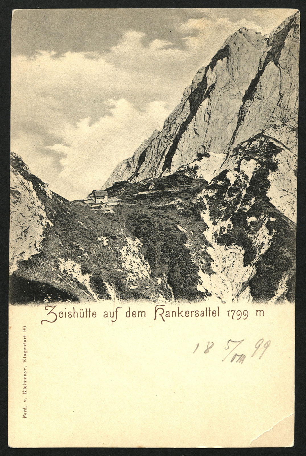 Pogled na Cojzovo kočo na Kokrskem sedlu. Razglednica oz. dopisnica (na zadnji strani ima prostor samo za naslov, na sprednji strani pa prazen prostor za pisanje pod slikovnim delom) ima pod slikovnim delom ročno pripisan datum: 5.8.1899. Kočo je leta 1867 zgradila Kranjska sekcija Nemško-avstrijskega planinskega društva. V slovenske roke je prešla po 1. svetovni vojni, ko jo je prevzelo SPD. Poimenovana je po bratih Zois in sicer Žigi Zoisu in botaniku Karlu Zoisu.