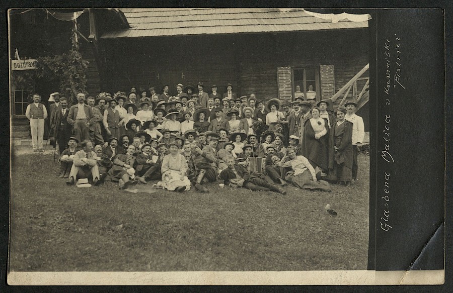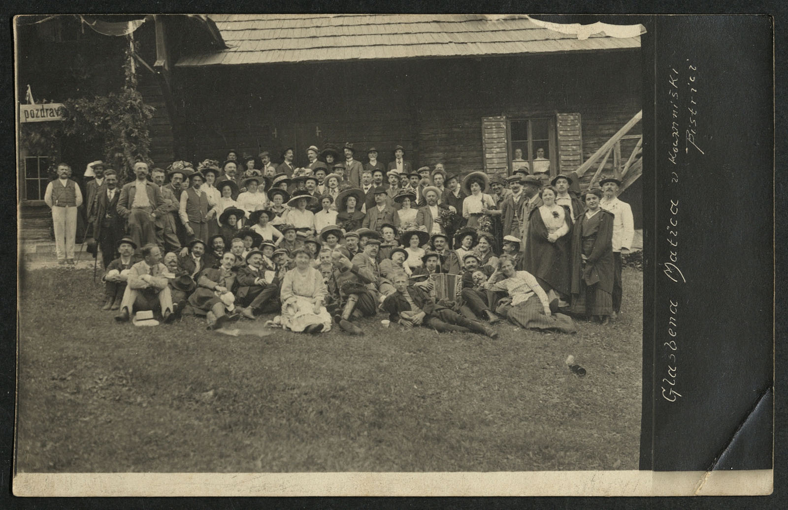 Člani Glasbene matice pred kočo v Kamniški Bistrici junija 1910.
