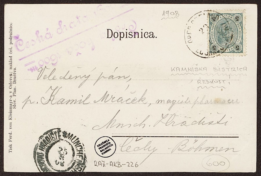 Razglednica z reprodukcijo slikarske upodobitve izvira Kamniške Bistrice. Razglednica je bila poslana leta 1908. Izdala jo je Češka podružnica Slovenskega planinskega društva, natisnil pa Ferdinanf von Kleinmayr v Celovcu.