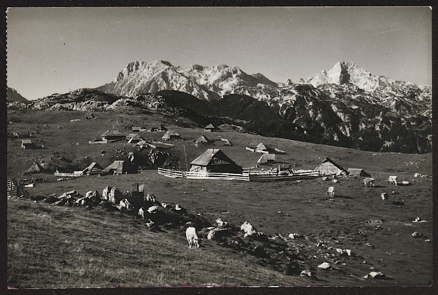 Velika planina, s pastirskimi kočami in govedom na paši. V ozadju vidimo vzhodni del Kamniško-Savinjskih Alp, od Kamniškega sedla, Planjave do Ojstrice.