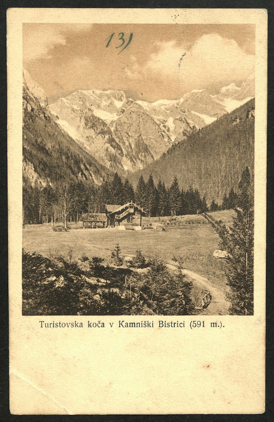 Dom pri izviru Kamniške Bistrice. Na razglednici vidimo stari planinski dom, ki so ga odprli leta 1909 in leta 1929 nadomestili s sedanjim, ki ima tudi teraso in depandanso.