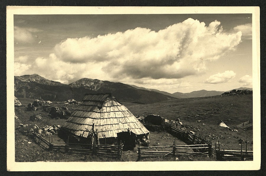 Pastirska koča na Veliki planini ograjena z lesenim plotom. Do prve svetovne vojne so se gradile le ovalne bajte, kasneje pa tudi pravokotne.