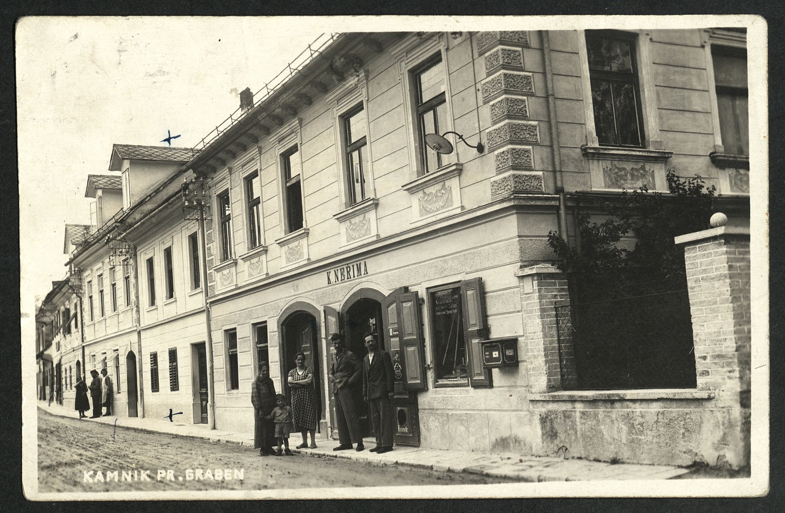 Graben proti severu. Na stavbi, katera danes nosi hišno številko 14, je viden napis K. Nerima.