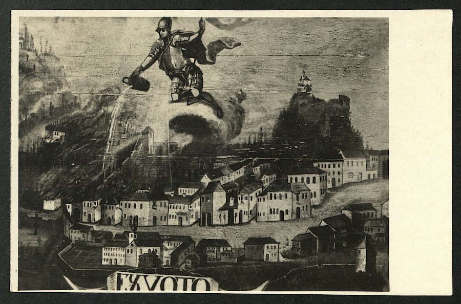 Posnetek slike poznobaročnega Kamnika. Motiv na razglednici je sv. Florijan, ki brani Kamnik pred požarom. Podoba slikana z oljem na desko. Spodaj je na napisnem traku napis Ex voto Stadt Stain 1779. Požar leta 1779 se je omejil le na Graben, zato so Kamničani darovali sliko po zaobljubi sv. Florijanu. Sliko so darovali cerkvi v Zakalu.