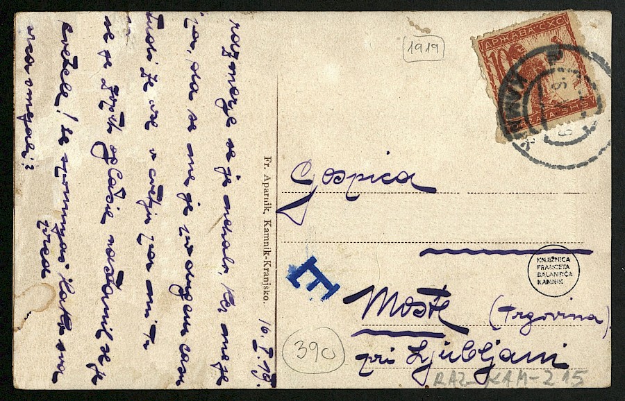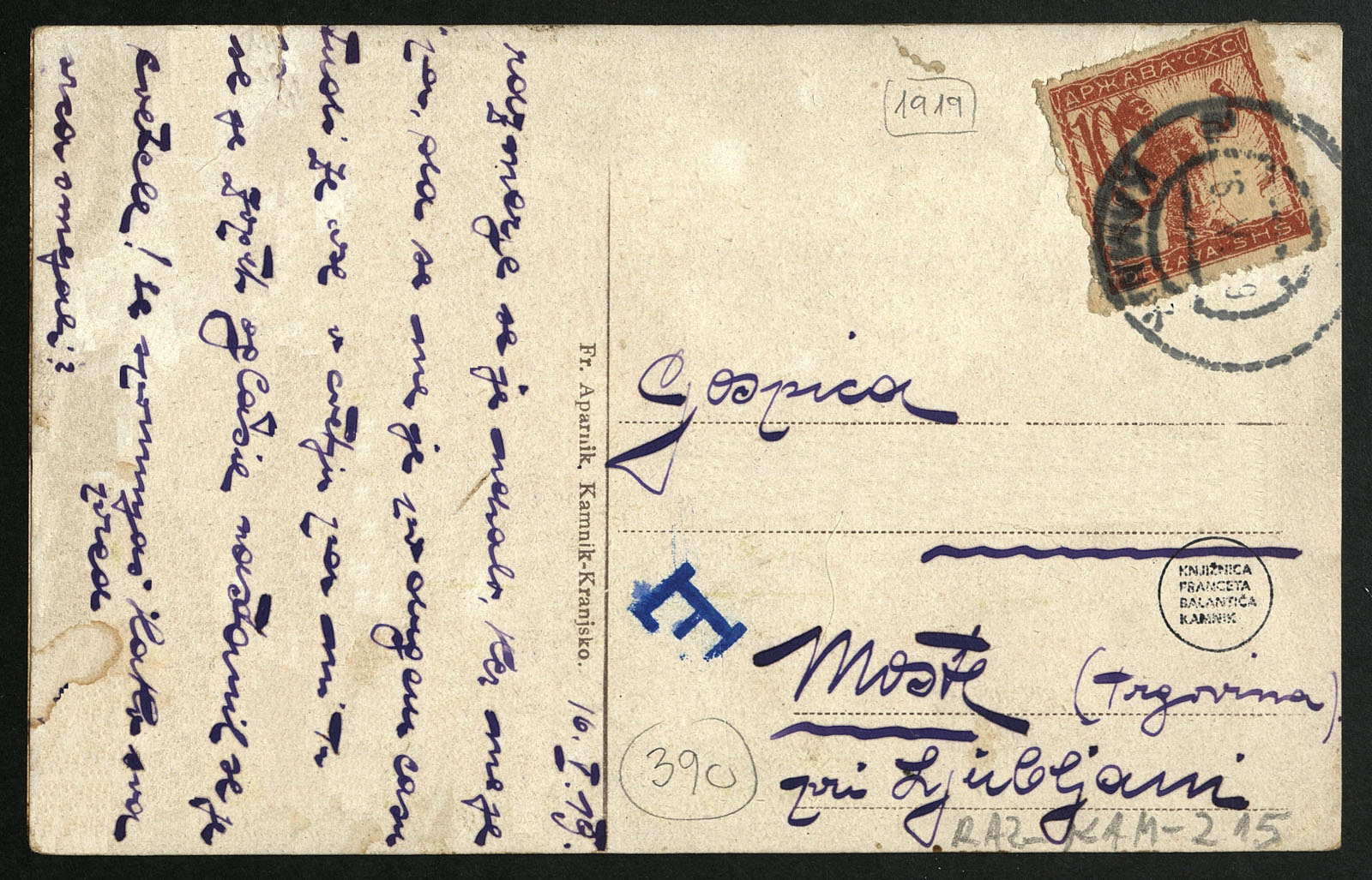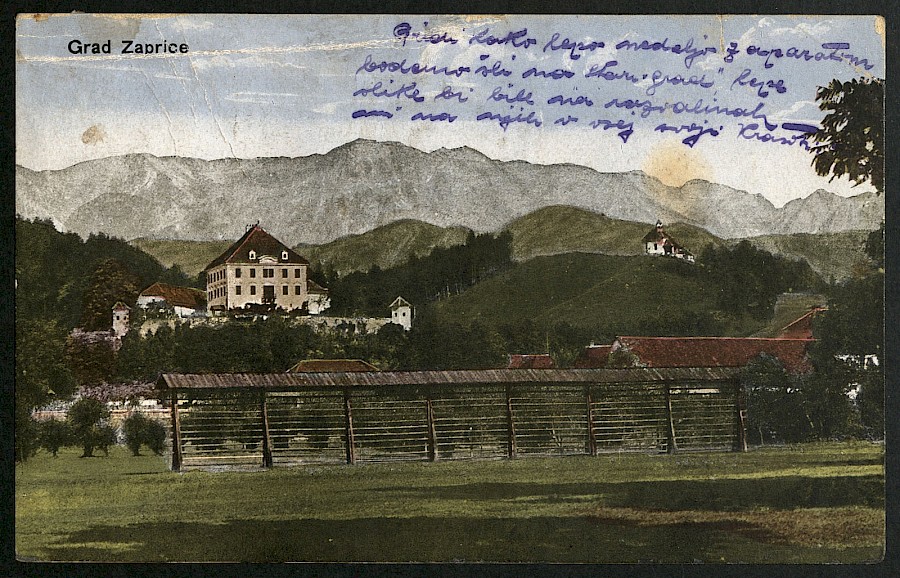 Pogled proti gradu Zaprice in Kamniškim Alpam. Na desni se dobro vidi žalska Kalvarija. Razglednica ima znamko na kateri je upodobljen suženj, ki trga verige - Verigar. Verigar je serija znamk, ki jo je leta 1918 zasnoval kamniški slikar Ivan Vavpotič (1877-1943). Kot suženj je upodobljen telovadec Stane Derganc (1893-1981). Avtor razglednice je kamniški fotograf Franc Aparnik (1872-1954).