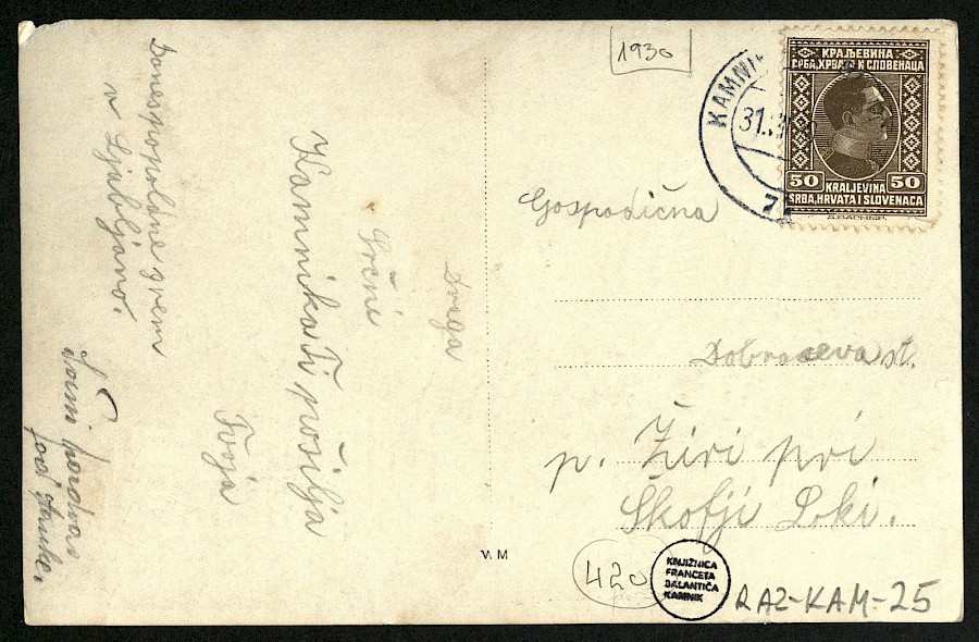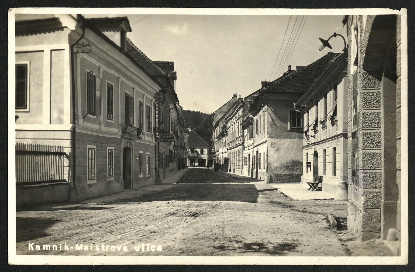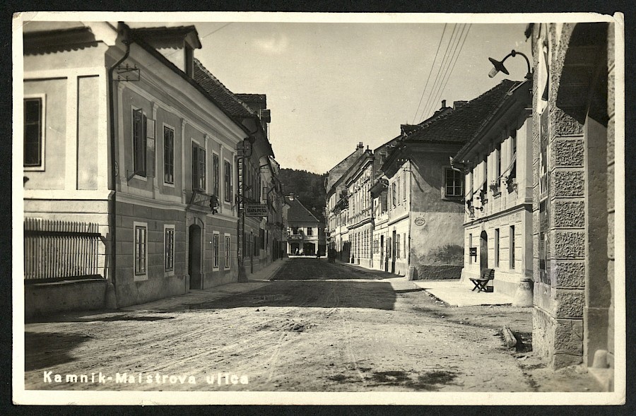 Pogled na Maistrovo ulico iz smeri današnjega Maistrovega mostu čez Kamniško Bistrico. Na desni strani vidimo oboke nekdanjega gasilskega doma (danes tržnica), sledijo današnji hotel Malograjski dvor in tretja v vrsti rojstna hiša Janeza Šlakarja (1791-1863).