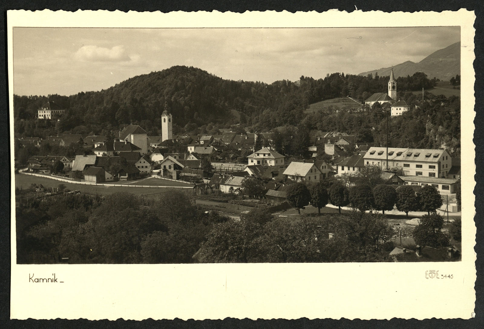 Pogled na Šutno s pobočja Starega gradu. Vidimo župnijsko cerkev na Šutni, Žale, Zaprice in Knafličevo tovarno, kasnejši Utok. Fotografija je najverjetneje delo fotografa Antona Šušteršiča (1872-1942), založila pa jo je papirnica M. Tičar v Ljubljani, ki je bila v lasti njegove žene Marije Šušteršič, rojene Tičar (1888-1926). Ime EMTE je sestavljeno iz začetnic imena in priimka Marije Tičar.