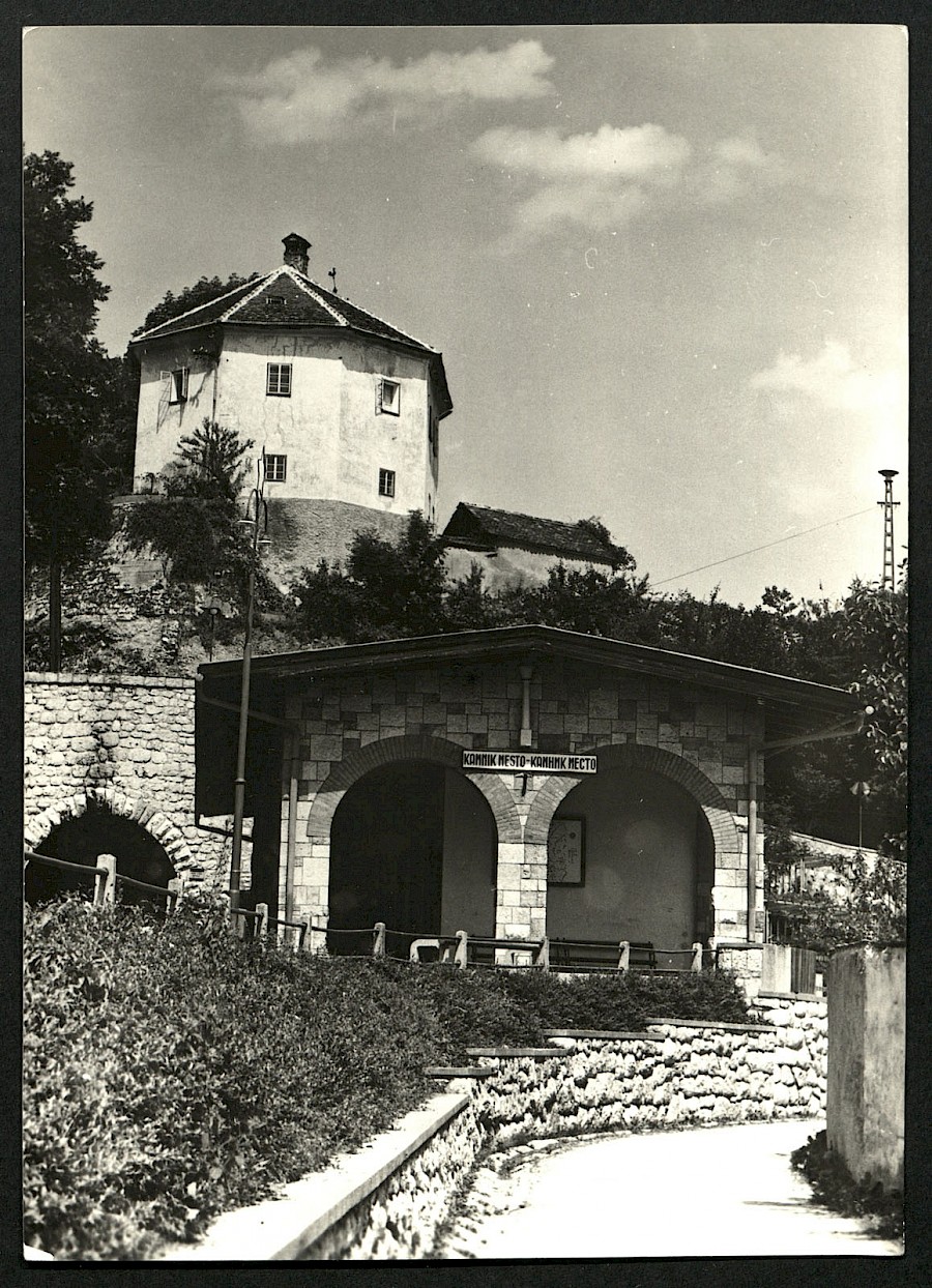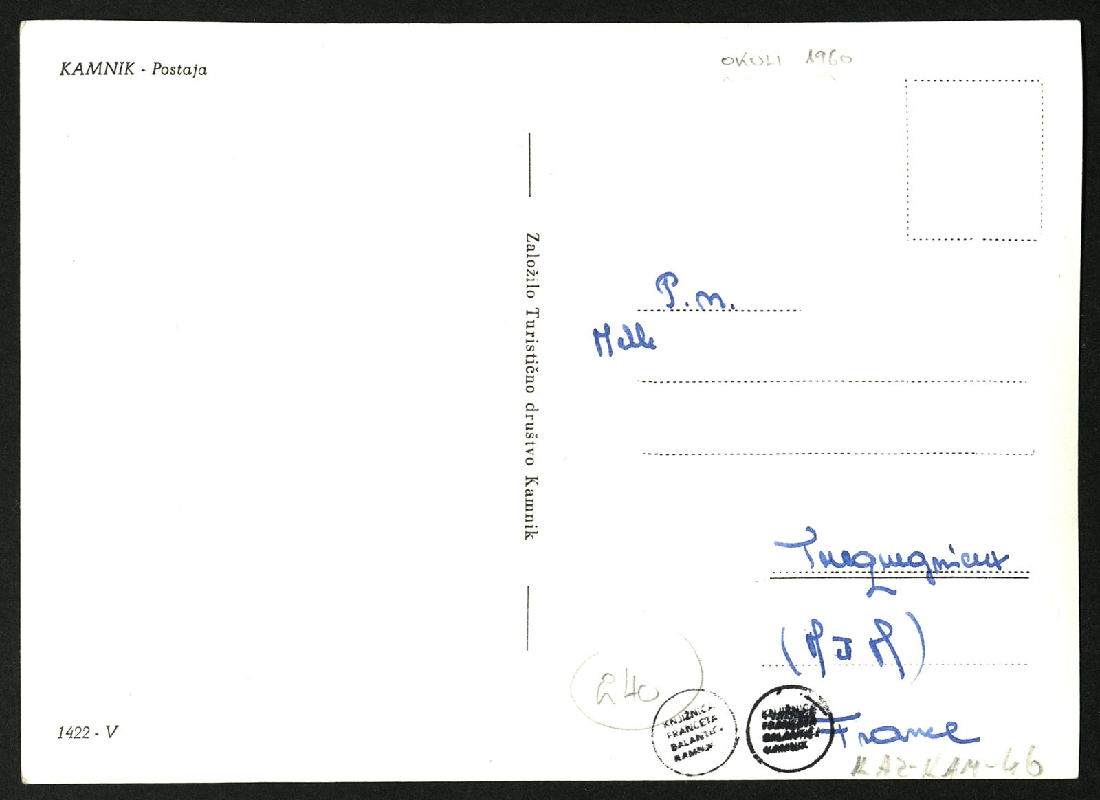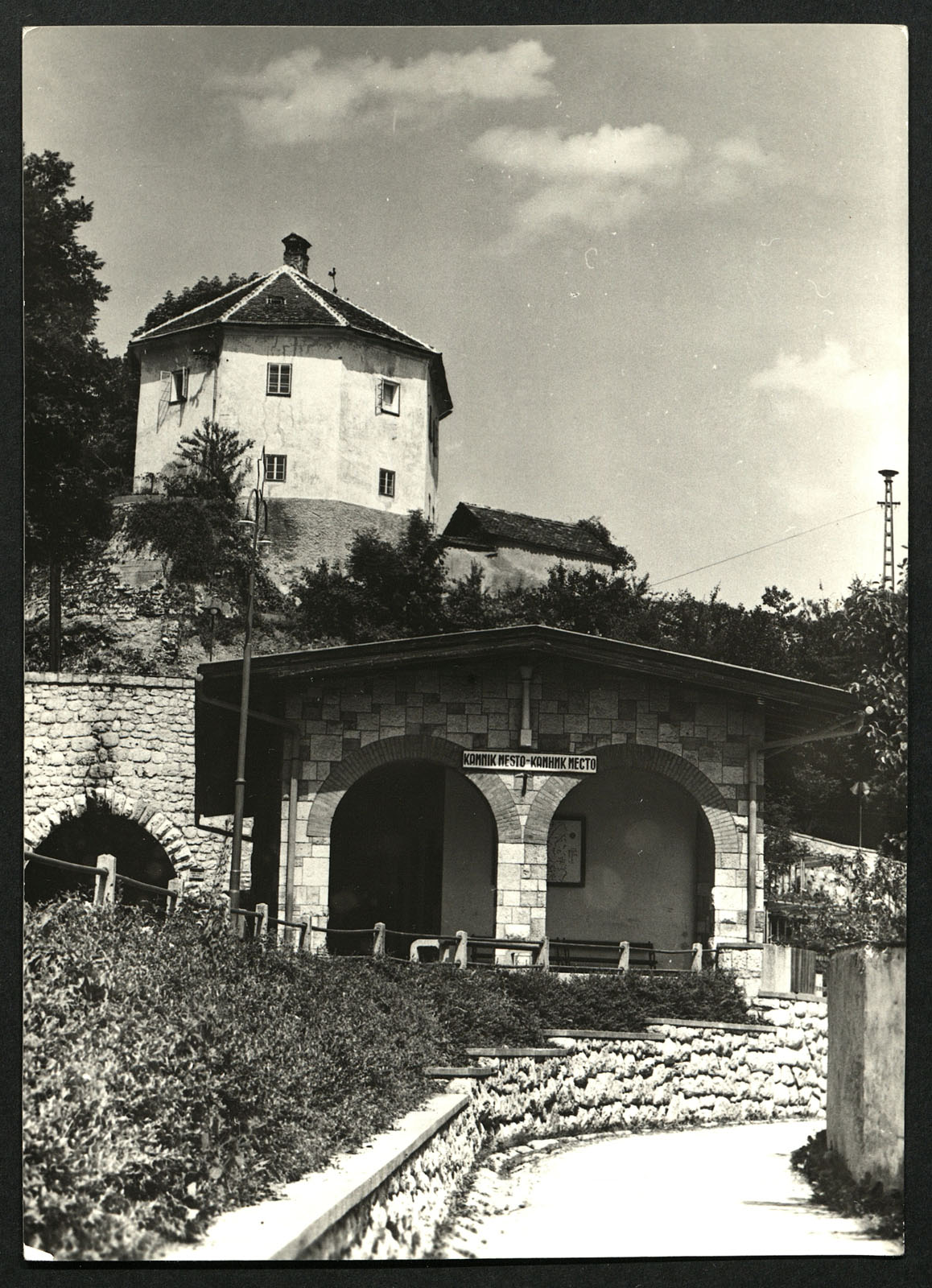 Želežniška postaja Kamnik-mesto. Postajni napis je v latinici in cirilici. Postajno poslopje je bilo dokončano leta 1940. Načrte zanj je izdelal Vinko Glanz (1902-1977), Plečnikov učenec. Nad postajo vidimo Smoletov gradič, znan tudi kot Trutzturn ali Rauterjeva graščina.