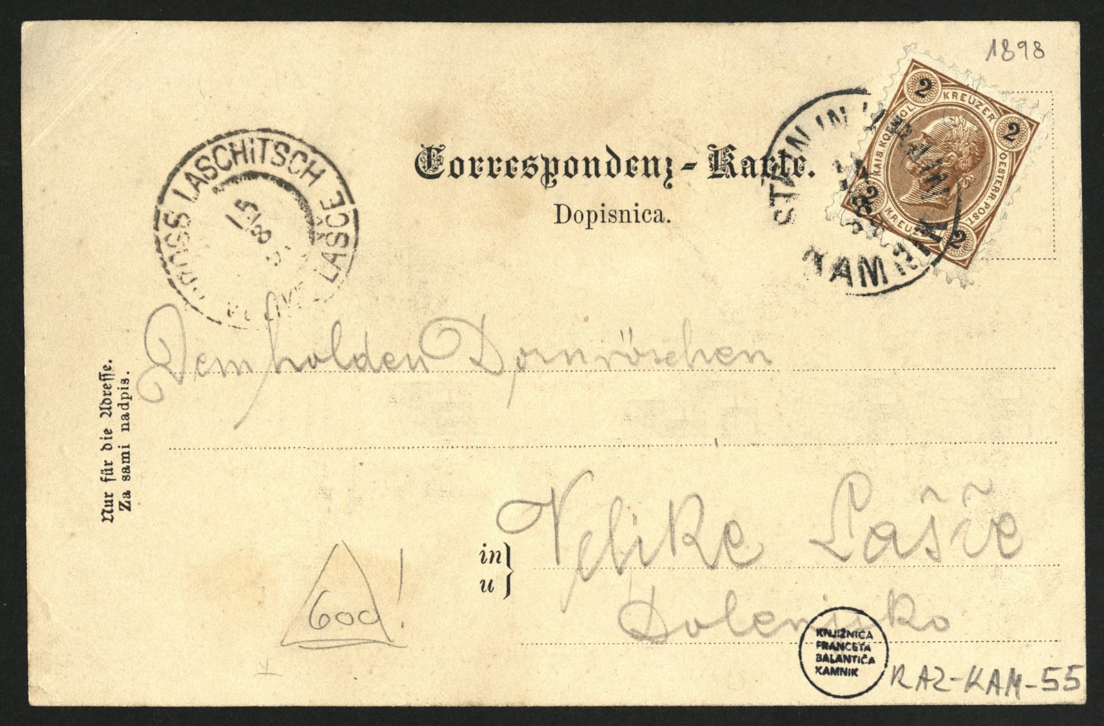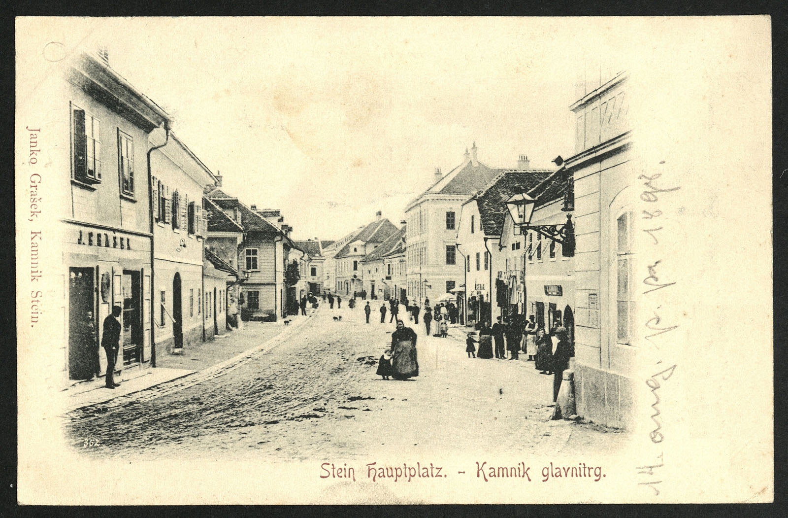 Glavni trg v Kamniku. Pogled proti severu. V stavbi na levi z napisom J. Grašek je bila trgovina, čisto na koncu ulice, kjer vidimo na zgradbi napis Fischer, je bil hotel.