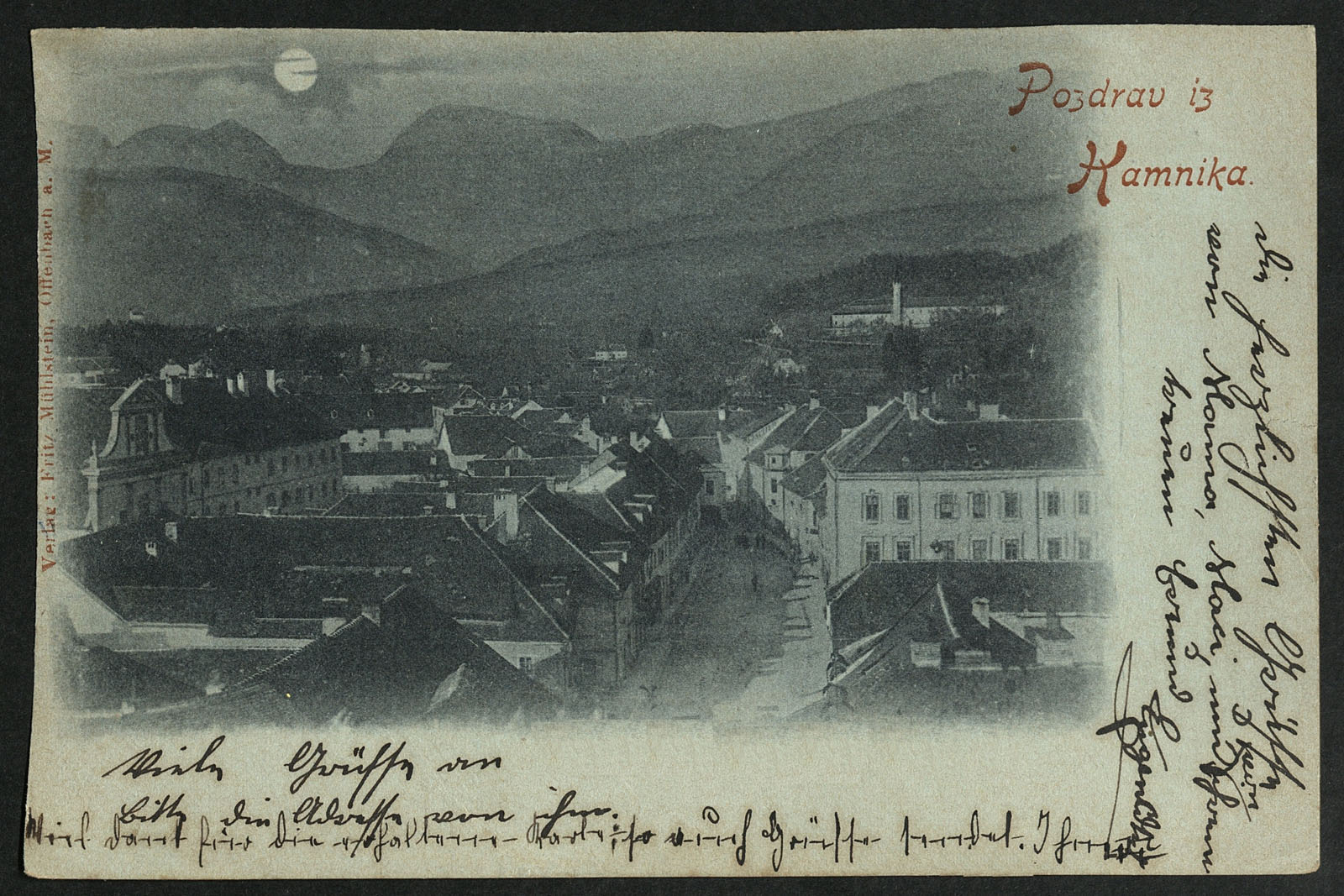Pogled na Kamnik z Malega gradu proti severu. Da bi razglednica vzbujala vtis nočnega posnetka, je avtor nad Kamniško sedlo dodal polno luno, ki je na tem mestu sicer nikoli ni mogoče videti.