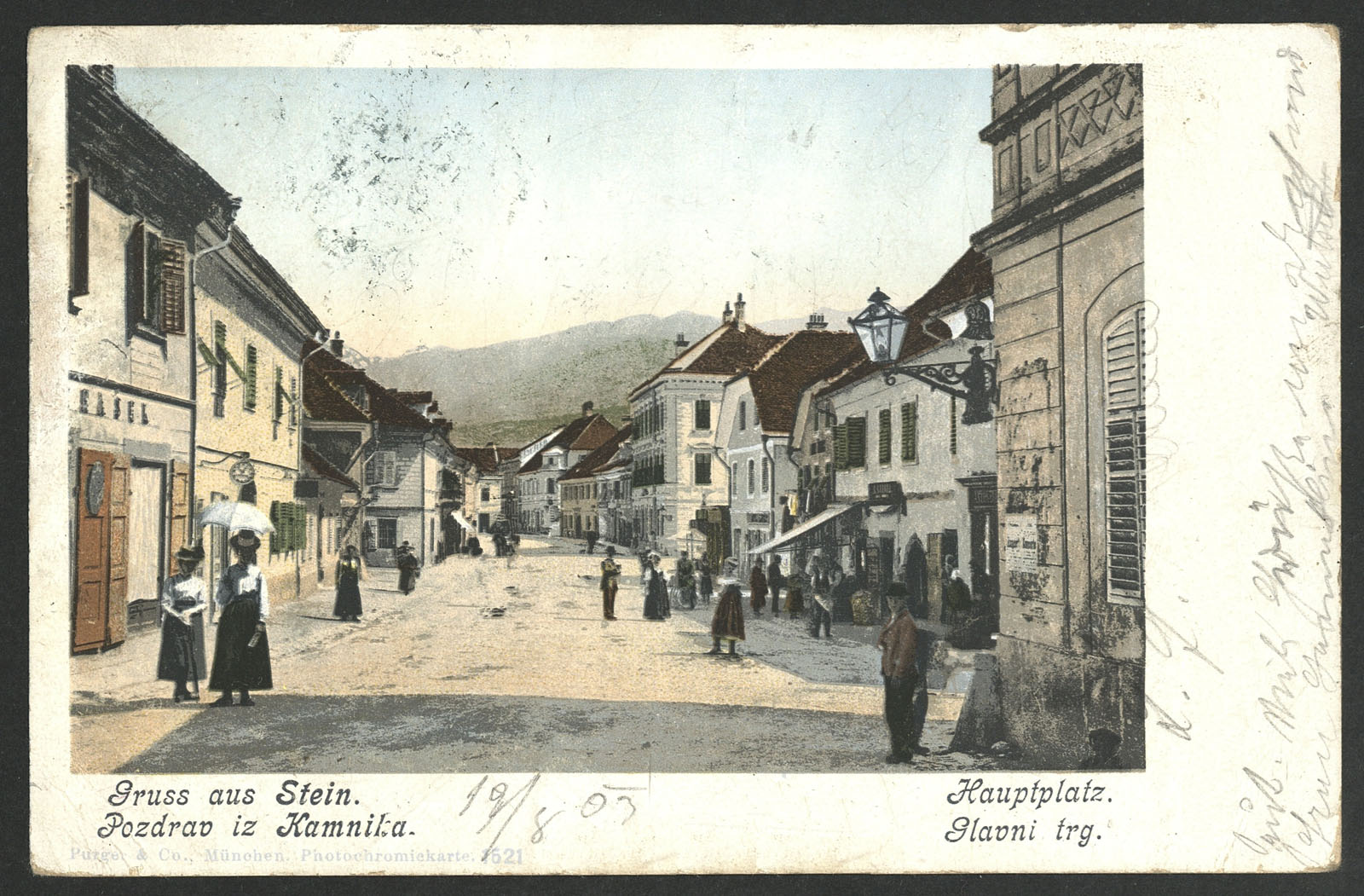 Glavni trg v Kamniku. Pogled od stavbe, kjer je bil od leta 1908 društveni dom, danes pa Kavarna Veronika, proti severu.