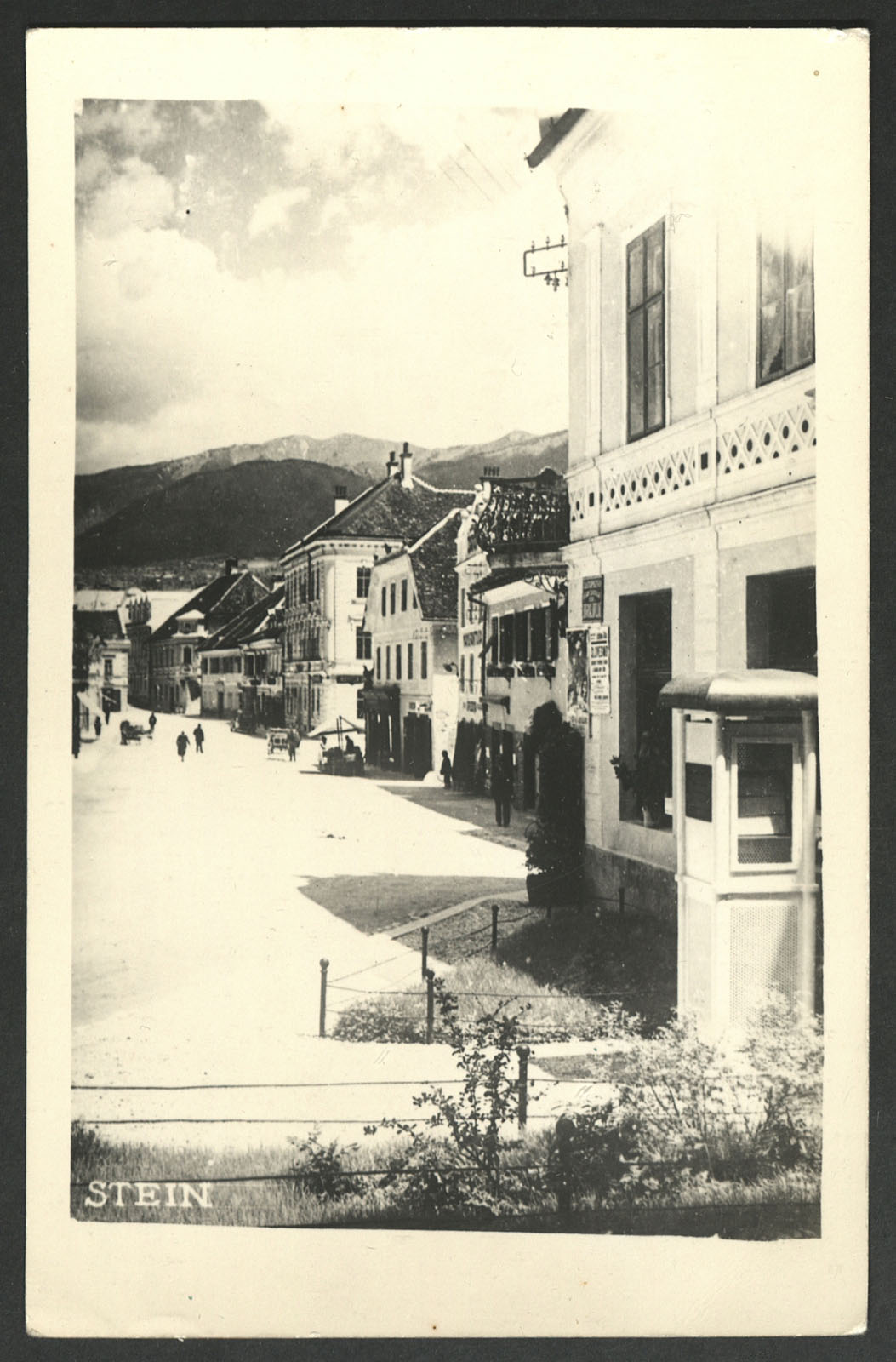 Pogled na Glavni trg proti severu. Vidimo poslopja na desni strani ceste, v ospredju pa je vremenska hišica, ki je stala pred društvenim domom, v katerem je bila Narodna čitalnica.