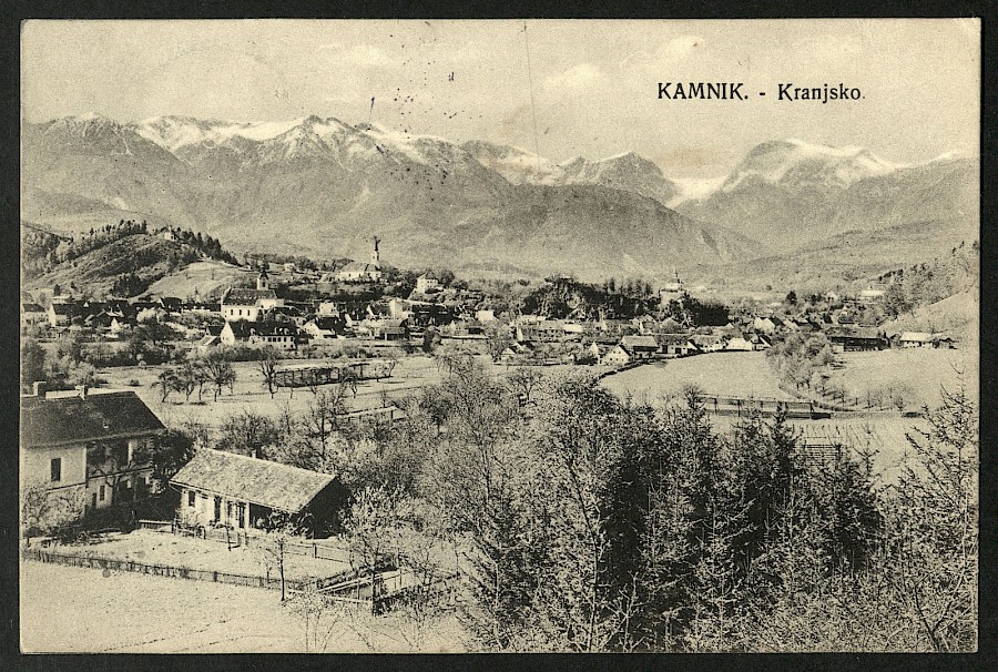 Pogled s Perovega na Kamnik. Vidimo Mali grad, Šutno, Žale, Kalvarijo in v ozadju Kamniške Alpe.