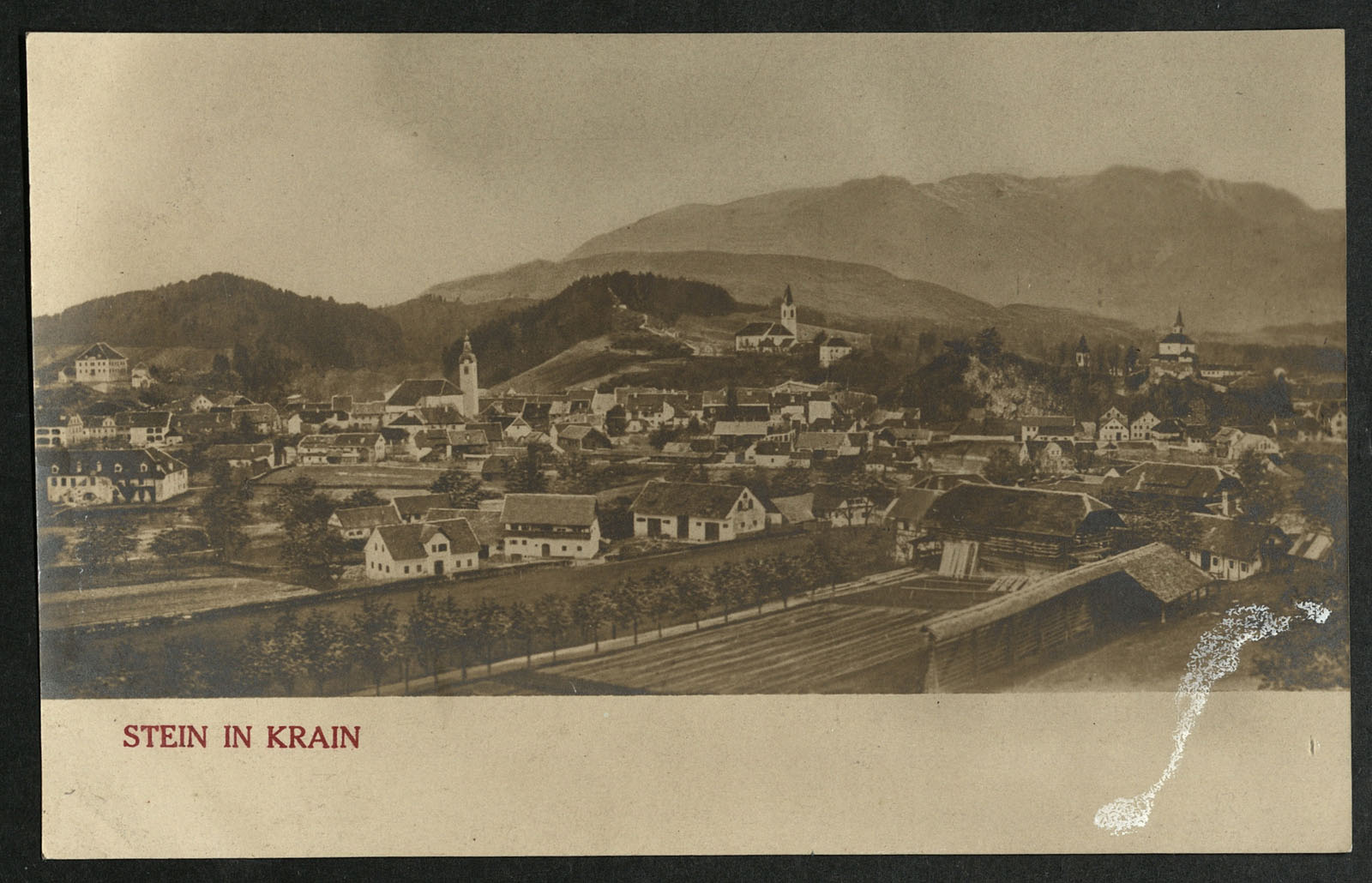 Pogled na Kamnik iz Novega trga. Vidimo Zaprice, Šutno, Žale s Kalvarijo, Mali grad, Novi trg.