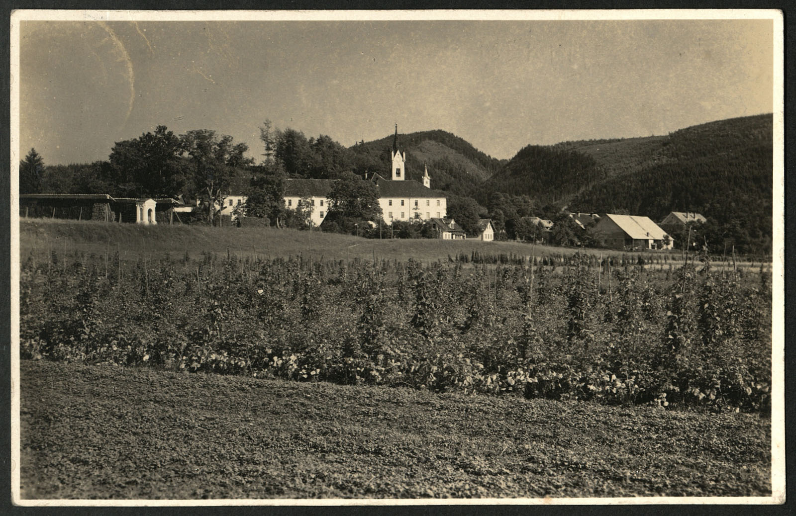 Pogled na mekinjski samostan z župnijsko cerkvijo.
