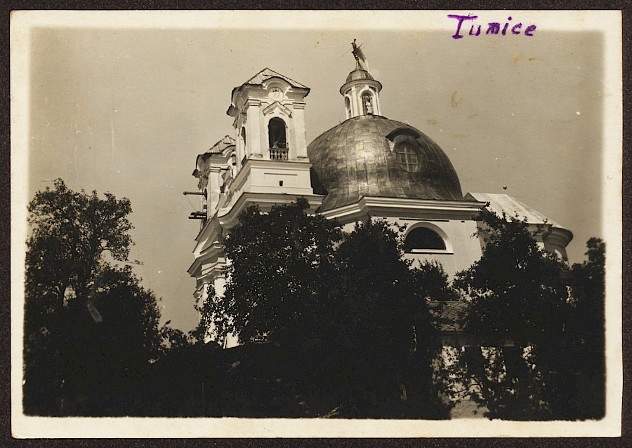 Razglednica s fotografijo župnijske cerkve sv. Ane v Tunjicah v času obnovitvenih del po požaru, ki je cerkev prizadel na velikonočno nedeljo, 31. marca 1929.