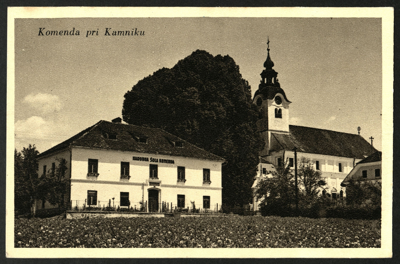 Razglednica iz časa 2. svetovne vojne. Pogled na župnijsko cerkev sv. Petra in tedanje šolsko poslopje. Razglednica je bila izdana v založništvu Andreja Mejača (1866-1941).