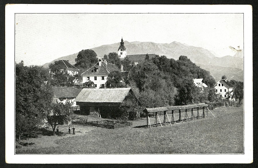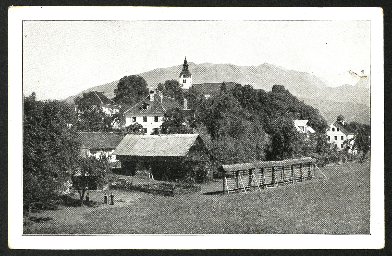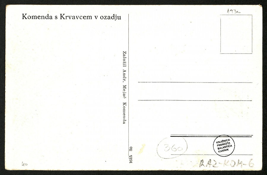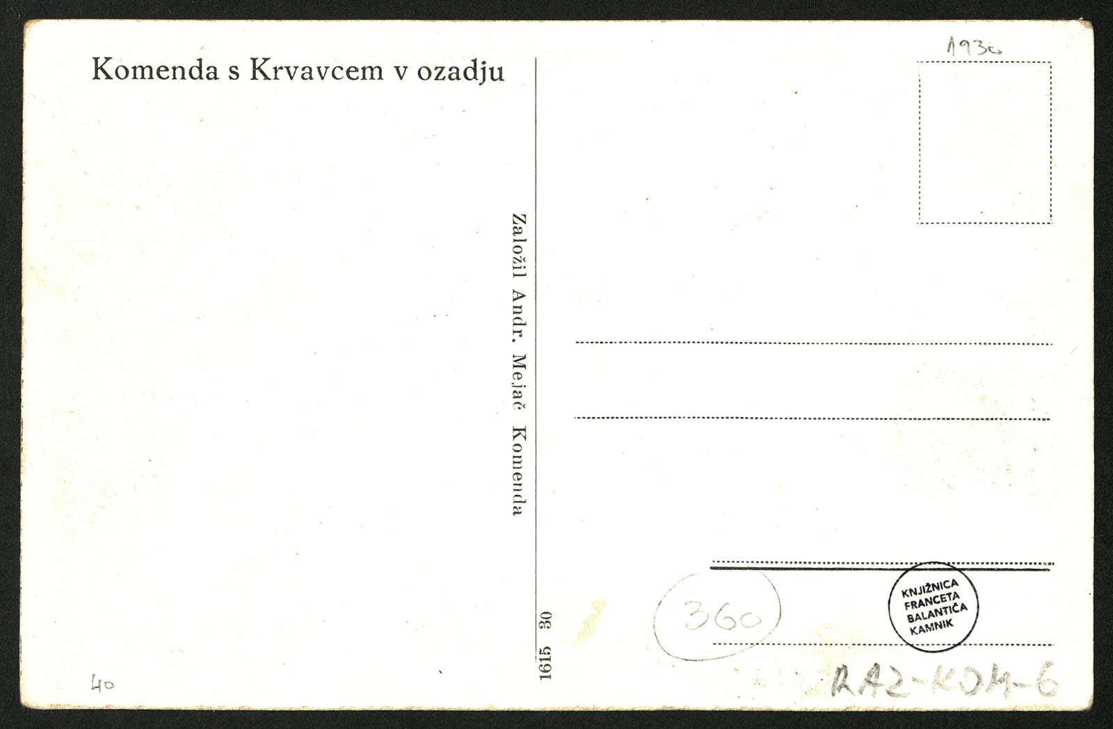 Pogled na Komendo. Poleg župnijske cerkve sv. Petra so vidna tudi poslopja Glavarjeve bolnišnice in beneficiatska hiša.Razglednica je izšla v založništvu komendskega politika, trgovca in gostilničarja Andreja Mejača (1866-1941).