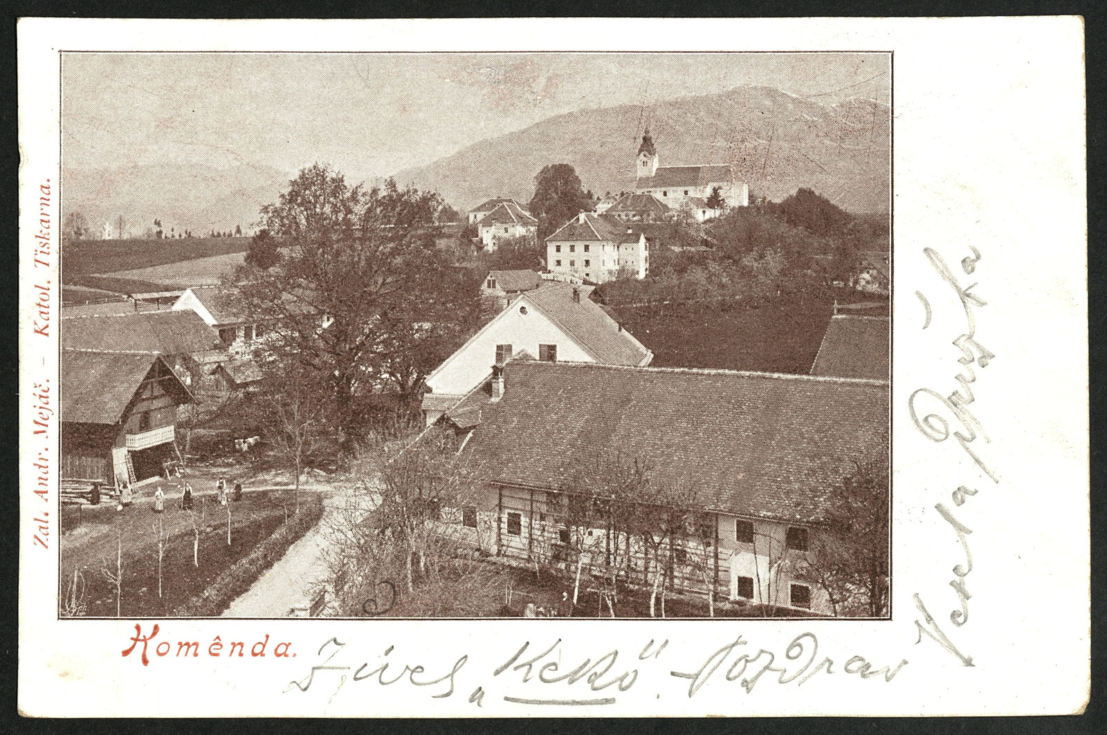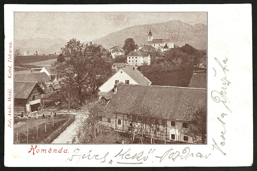 Komenda v začetku 20. stoletja. Na razglednici poleg župnijske cerkve sv. Petra lepo vidimo tudi poslopji beneficiatske hiše in bolnišnice, ki ju je dal postaviti Peter Pavel Glavar (1721-1784). Razglednica je izšla v založništvu komendskega politika, gostilničarja in trgovca Andreja Mejača (1866-1941).