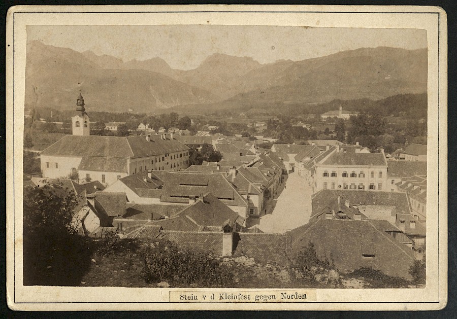 Pogled na mesto Kamnik izpred stolpa na Malem gradu konec 19. stoletja. Frančiškanska cerkev sv. Jakoba je kasneje dobila drugačno pročelje. Fotografija na kartonu blejskega fotografa Benedikta Lergetporerja (1845-1910) je iz gradiva, ki ga je kamniški knjižnici daroval Aleksander Sarnavsky (1934-2010).