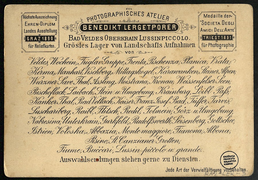 Za velikodušno posredovanje informacij in natančno datacijo nastanka Lergetporerjevih fotografij iz Kamnika in okolice se zahvaljujemo dr. Draganu Božiču.
