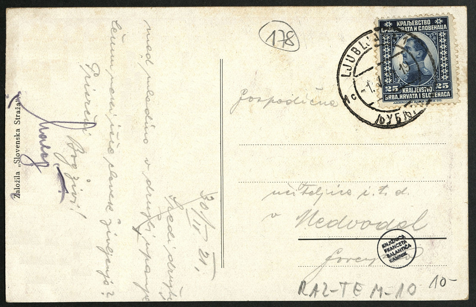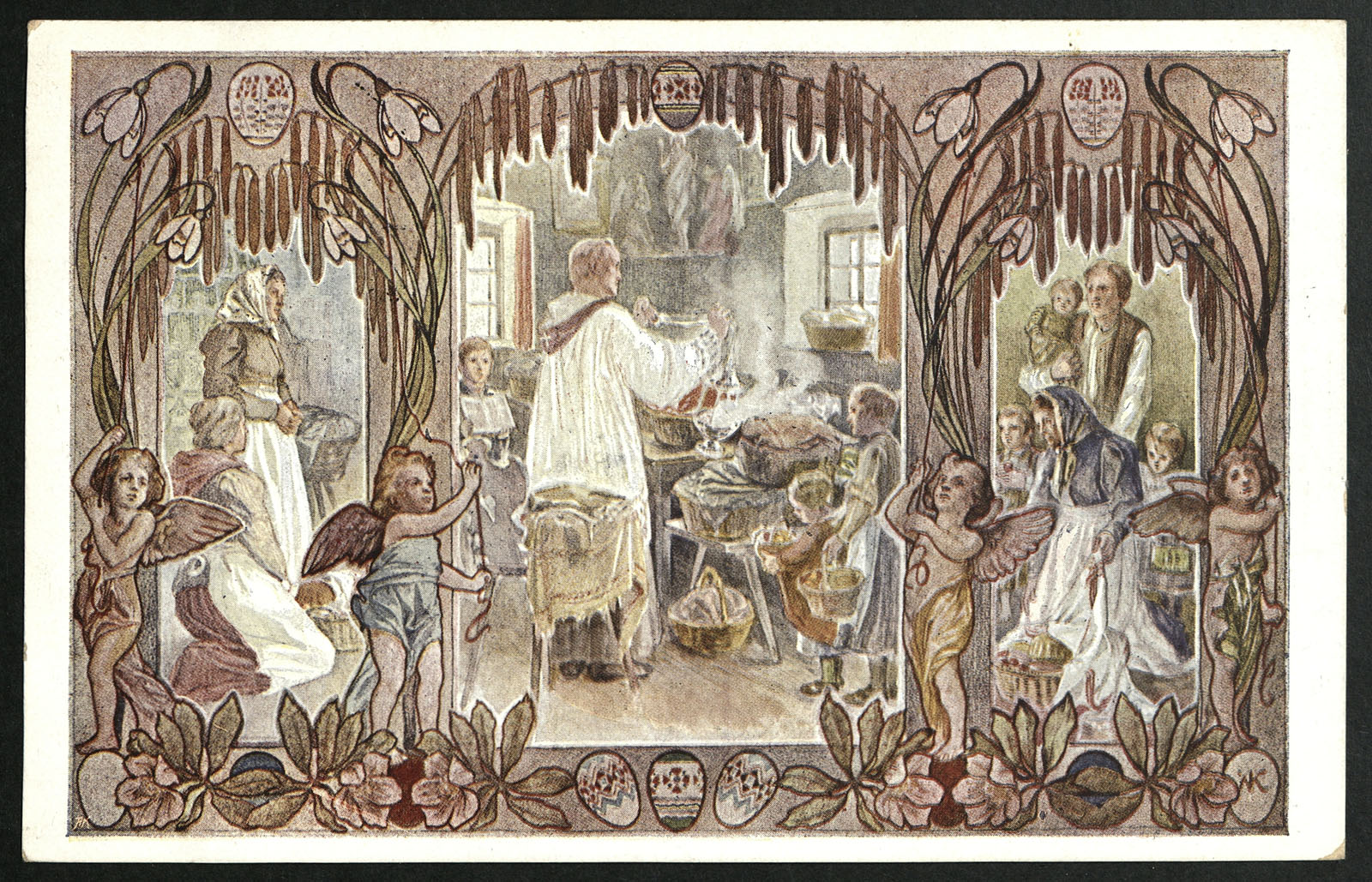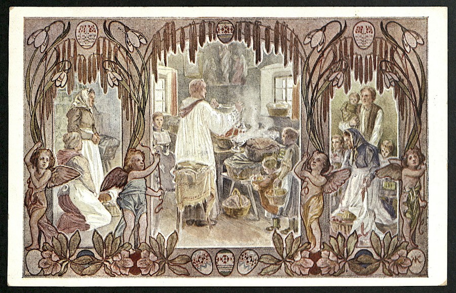 Na risani razglednici vidimo tri motive Velike noči, okrašene z vinjetami. Avtor je verjetno Ivan Vavpotič (1877-1943).