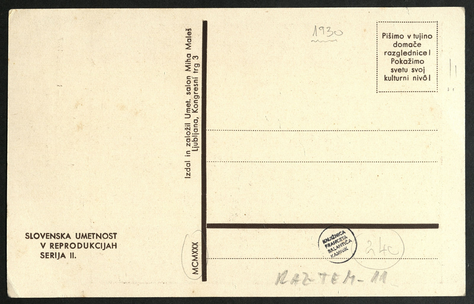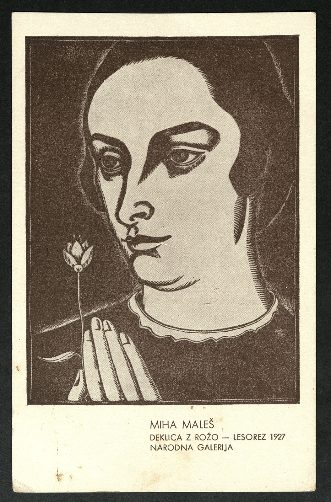 Na razglednici je lesorez Mihe Maleša (1903-1987) Deklica z rožo iz leta 1927. Na hrbtni strani je napis: Slovenska umetnost v reprodukcijah. Serija II..