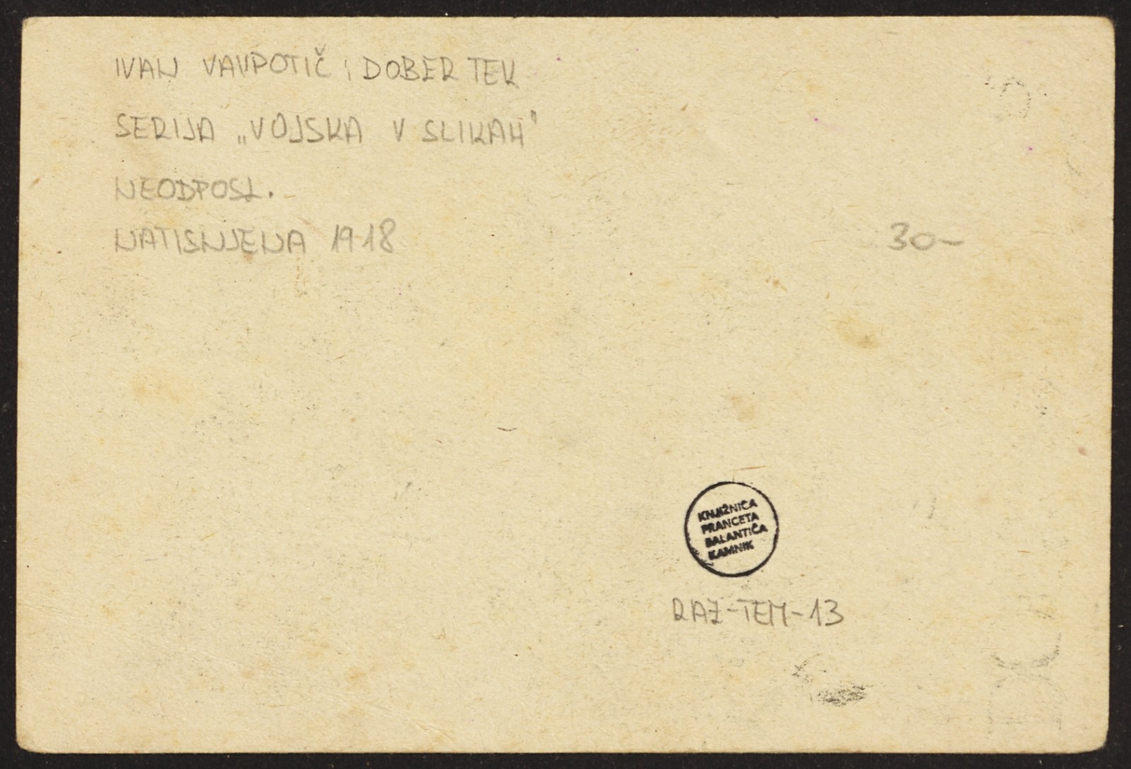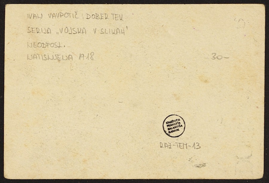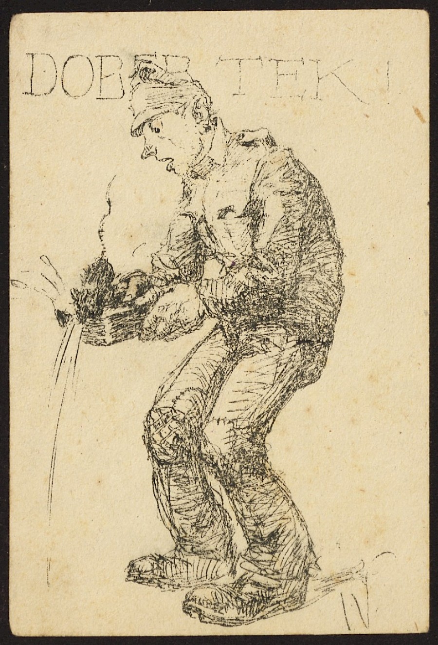 Razglednica z motivom vojaka s skledo iz leta 1918. Avtor razglednice je kamniški slikar Ivan Vavpotič (1877-1943).