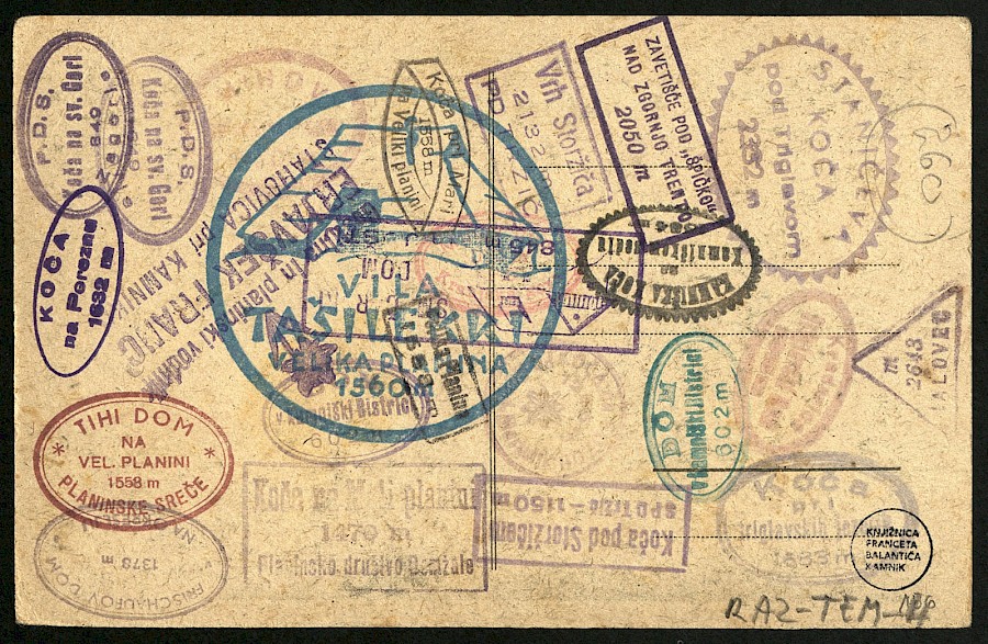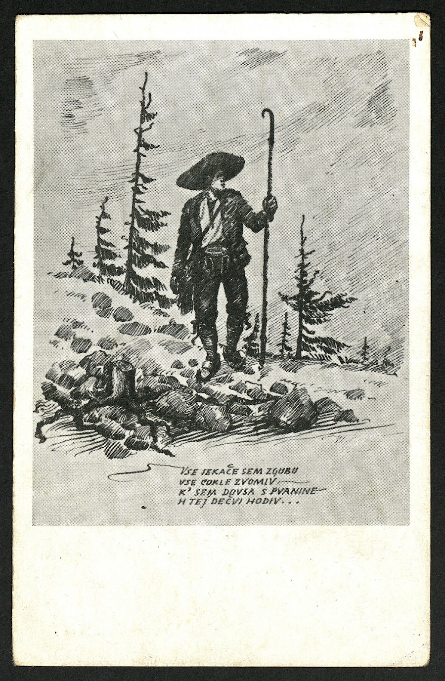 Risana razglednica prikazuje planšarja s pohodno palico. Spredaj pod podobo planšarja vidimo verze: Vse sekače sem zgubu, vse cokle zvomiv - k' sem dovsa s pvanine h tej dečvi hodiv ... Hrbtna stran razglednice je v celoti prekrita z žigi iz planinskih koč.
