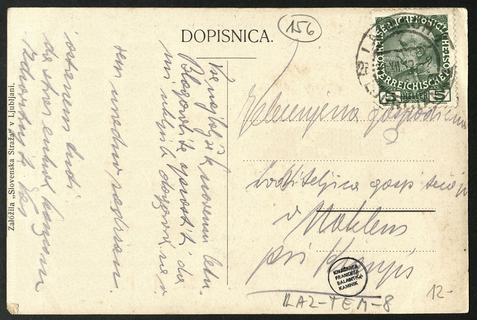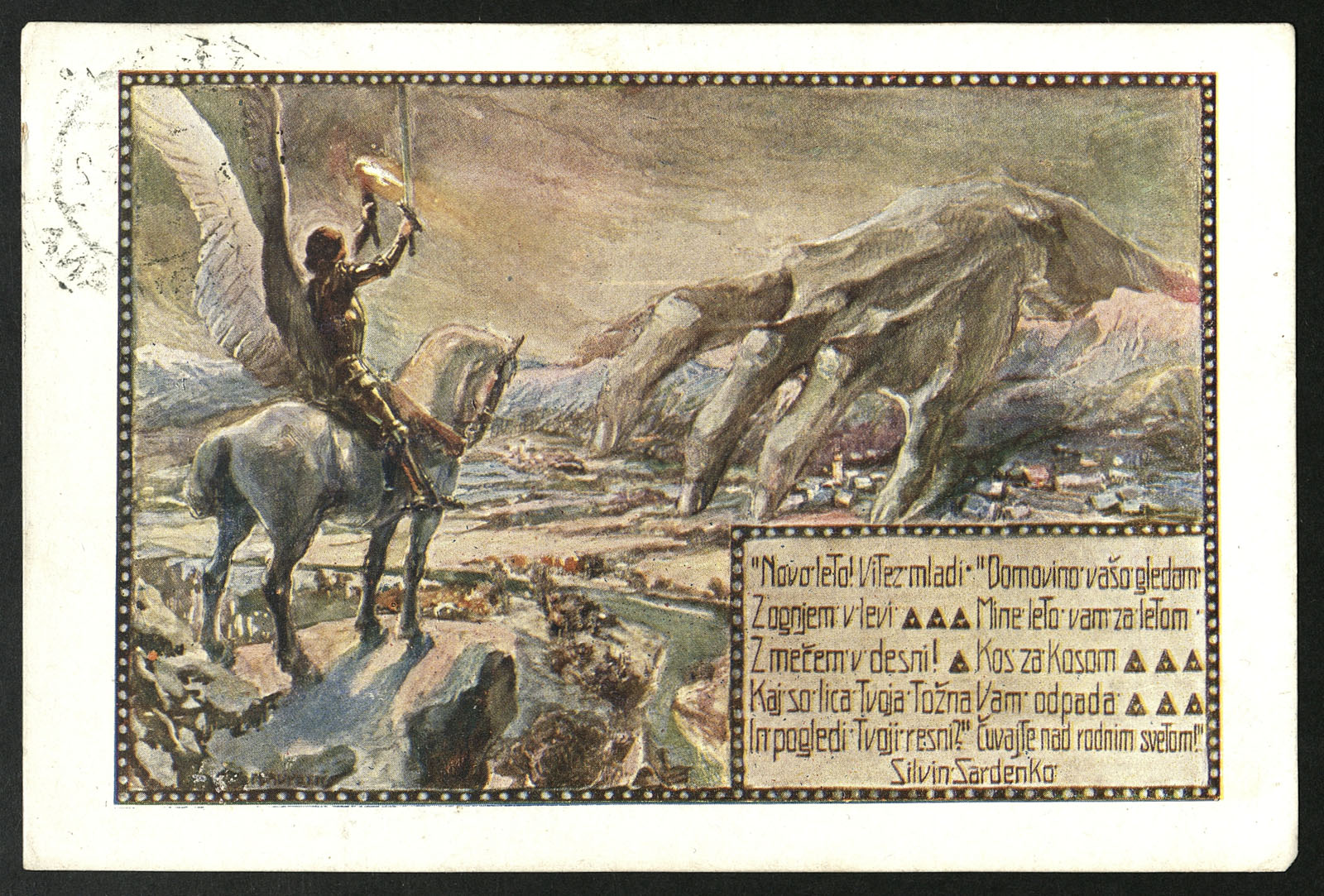 Na razglednici, ki je delo kamniškega slikarja Ivana Vavpotiča (1877-1943) vidimo angela jezdeca na konju. V eni roki drži meč, v drugi pa baklo. Obrnjen je proti goram, nad katerimi se že steguje roka, ki si hoče prilastiti deželo pod gorami. V desnem kotu so verzi, pod katere je podpisan Silvin Sardenko. Gre za psevdonim Alojzija Merharja (1876-1942).